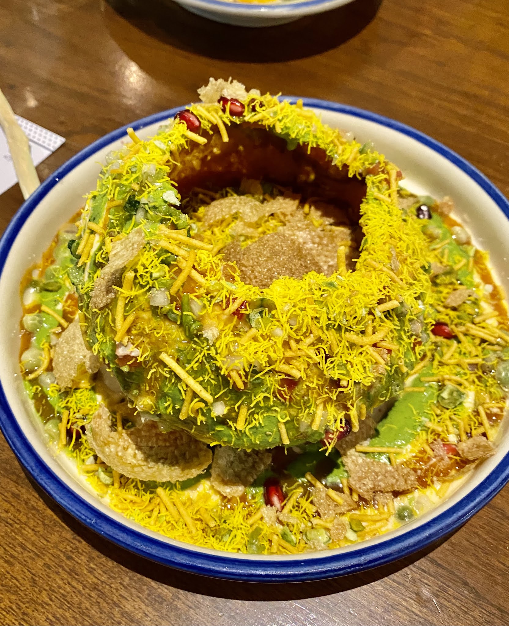- - A Raj Kachori of toor dal, amchor chutney, ragda, picked dahi and crispies